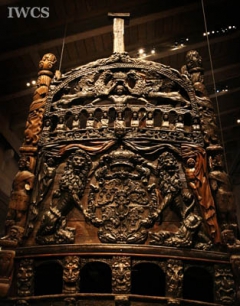 On January 16, 1628, Vasa sank on her maiden voyage after departing from Stockholm and sailing for just 1,500 meters. Vasa was decorated with sculptures carved in oak, pine or lime, and each of these sculptures has its underlying significance. For example, the sculptures of Roman emperors, which stand along the sides of the beak head, represent the glory and the power of Swedish King Gustav II Adolf (King Gustavus Adolphus); moreover, a male figure in a crouching position under the cathead signify that Polish men was inferior to Swedish men, because Poland and Sweden were at war in the 1620s, and more.