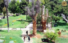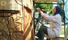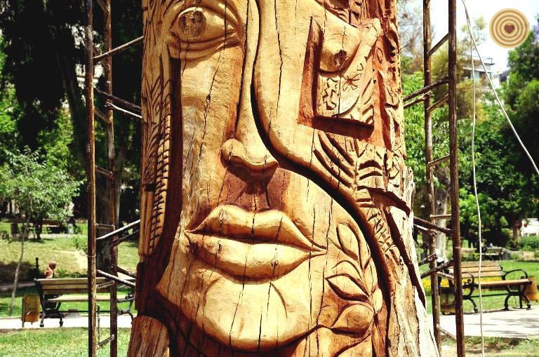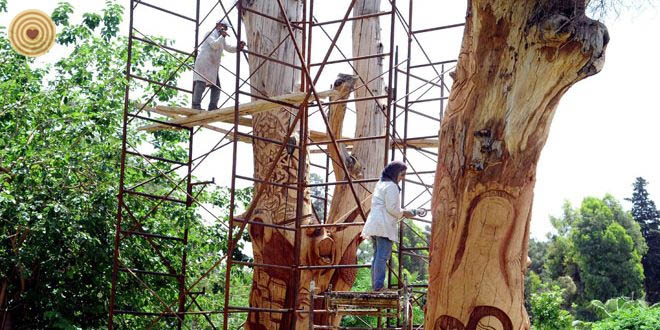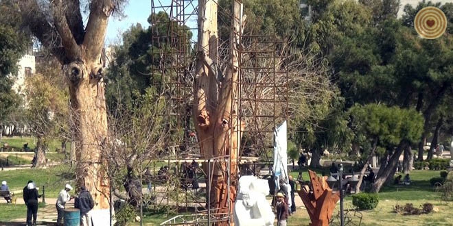 Those two Kina trees are well-known and long-lived in Damascus, they have remained for many generations and attended many historic phases in early time. They were to be burned, it was the ideas of Mr. Moufak Makhoul to revive them in a certain way, and the Syrian trees never die. As the thickness and height of the trees, the process of engraving is done on the dry and died trees that are more than 130 year-old. The work is not just in related to sculpture, and as well as to give it an aesthetic value, the historic value, and the educational value of how we employ the dry trees instead of burning it. The artists tried to make them a tableau with inscriptions, and asserting the origins of art and civilization in Syria.