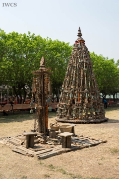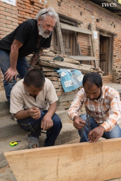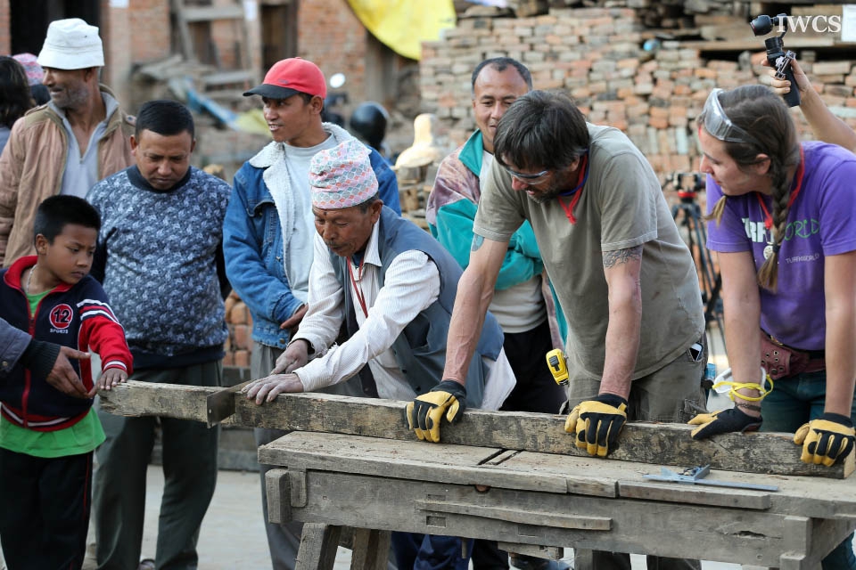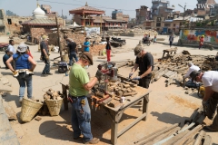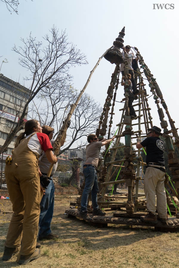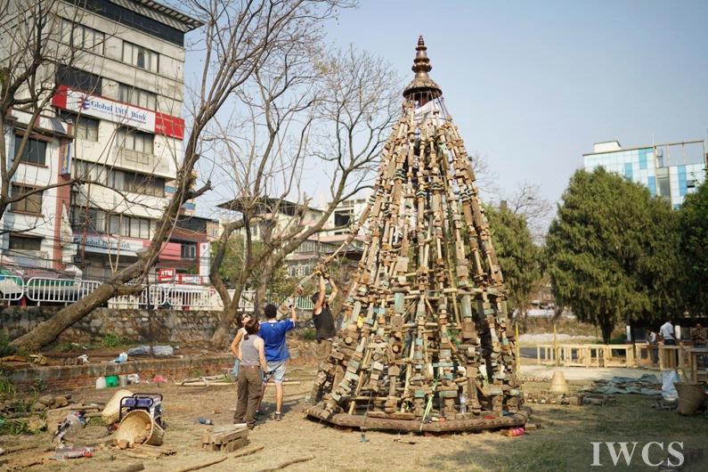 Renowned sculptor David Best, who has designed and built nine Burning Man temples at Black Rock Desert and various temples in other countries, and his crew, made of volunteers from the United States of America, were invited to create a community stupa in honor of the people of Nepal who suffered greatly from the 2015 earthquakes. The construction site located in Bungamati, a well-known traditional woodcarving village that has had more than 70% of its buildings damaged in the earthquakes. The Temple Crew cut and drilled rough-hewn logs and planks into manageable blocks that were strung on iron rebar and fashioned into the shape of a classic Nepali stupa. This stupa is composed of thousands of pieces of wood representing earthquake victims. Along with bringing international attention to the ongoing wood carving tradition of Bungamati, this project also helped to rejuvenate the community by interacting with local people and artists. The stupa is currently displayed at the Nepal Academy and will eventually be moved back to Bungamati.