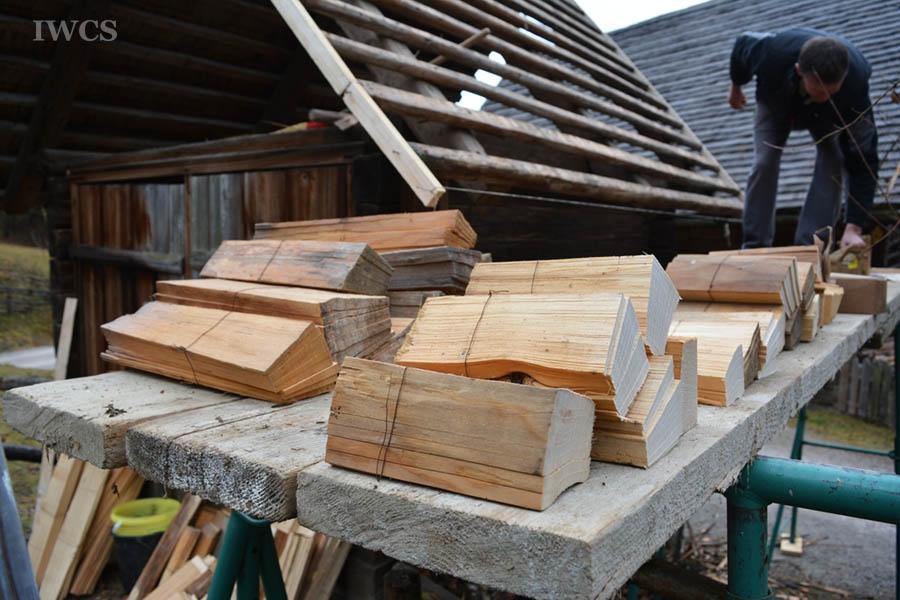 Wooden shingles as a roofing have a long tradition in Austria. There are several designs depending on the regions, and one type is called the "Schieferschindel". Due to its airy setup, it is possible to use less durable wood species for this particular type, but wood quality is still a key factor in shingle production. The roofing shown in the video has lasted for 37 years and is now being replaced by the craftsmen of the Austrian Open-Air Museum Stübing.